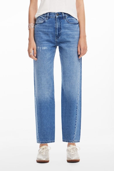 Blugi drepti cu detalii deteriorate si imprimeu