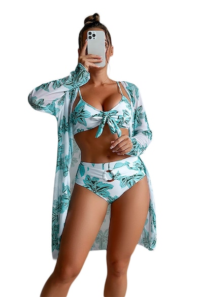 Costum de baie, set 3 piese, model incitant, sutien tip bustiera, chilot talie inalta si cover cu maneci lungi asortat, tematica summer queen, EFAYN
