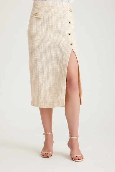 Detalii: slit pe partea din fata, material din tweed, nasturi decorativi