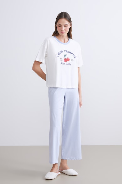 Pijama din bumbac cu imprimeu si maneci scurte, Albastru pastel, Alb optic,