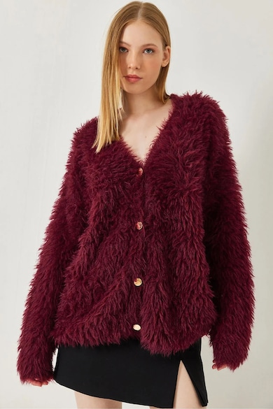 Pulover dama, cardigan gros, decolteu in V, maneci lungi, visiniu, tricot,