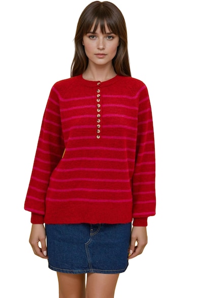 Pulover dama cu guler cu nasturi, model cu dungi, tricot, rosu,