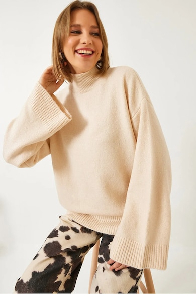 Pulover dama, guler inalt supradimensionat, buline, bej, tricot,