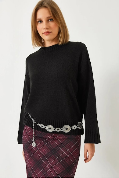 Pulover dama Relaxed Fit, guler rotund, negru, tricot,