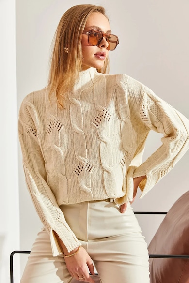 Pulover dama, texturat, guler inalt, alb-galbui, tricot,
