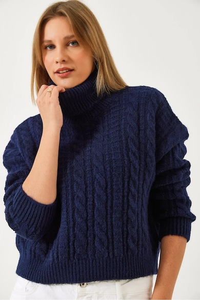 Pulover dama, texturat, guler inalt, bleumarin, tricot,