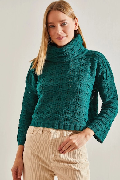 Pulover dama, texturat, guler inalt, verde, tricot,