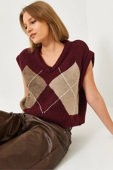 Pulover dama, tricotat supradimensionat, decolteu in V, visiniu,