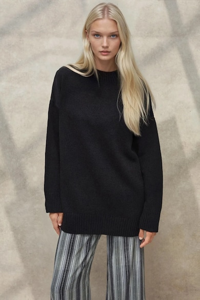 Pulover lung, tricotat gros, guler rotund, negru, tricot