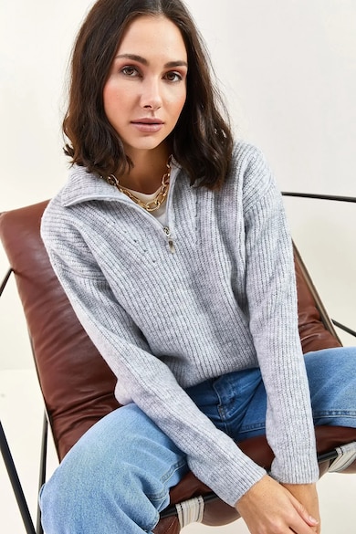 Pulover tricotat supradimensionat cu guler cu fermoar, acrilic si poliester,