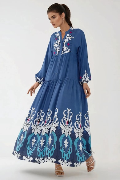 Rochie maxi maneca lunga, imprimeu, albastra/alb, viscoza