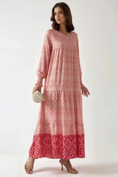 Rochie maxi viscoza, guler rotund, roz, maneci lungi