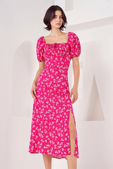 Rochie midi cu imprimeu floral, funda, roz, viscoza,