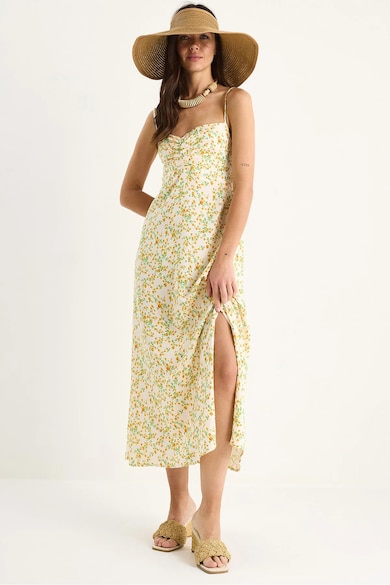 Rochie midi, fara bretele, imprimeu floral, crapatura, viscoza