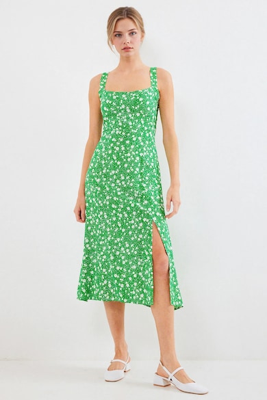 Rochie midi guler patrat, crapatura eleganta, verde, viscoza