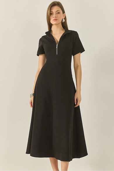 Rochie midi mulata, guler cu fermoar, negru, poliester-elastan