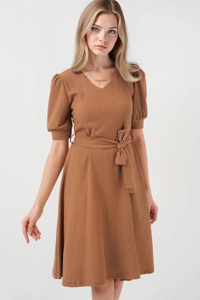 Rochie midi tricotata texturata, decolteu in V, funda, bej, jerseu