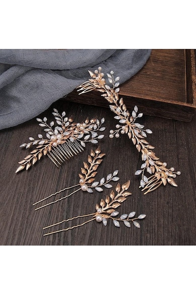 Set 4 accesorii de par, aurii, cu frunzulite si pietre, Ramses C11,