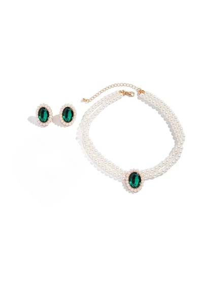 Set colier si cercei, auriu, cu perle si pietre verzi, Otta C4