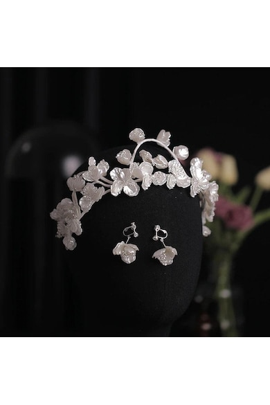 Set coronita si cercei, argintiu, cu flori albe, Elver C15,