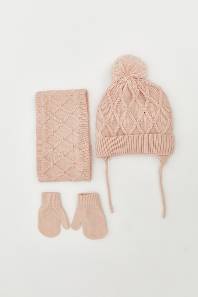 Exterior: caciula: 100% acrilic, fular: 100% acrilic, manusi: 75% acril, 22% poliester, 2% elastodiena, 1% elastan