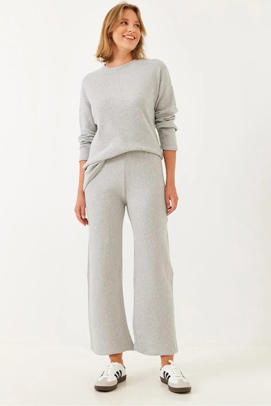 Set pulover lung si pantaloni guler rotund, texturat, gri, bumbac si lycra