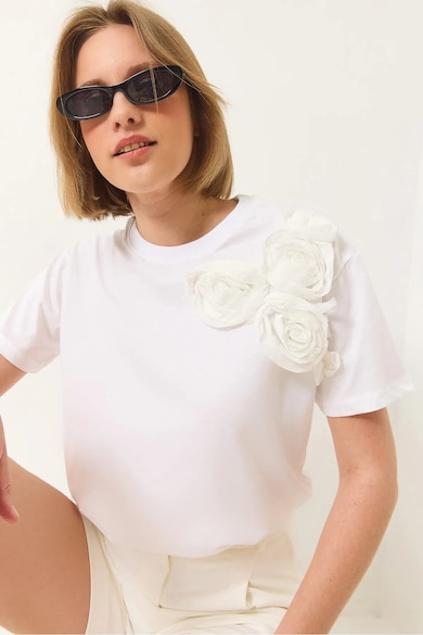 Tricou dama guler rotund, detalii decorative, alb, bumbac