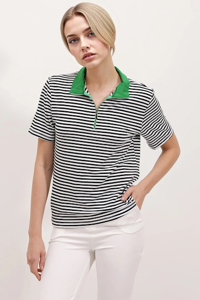 Tricouri dama, Tricou cu guler cu fermoar, dungi, verde, viscoza/ lycra,