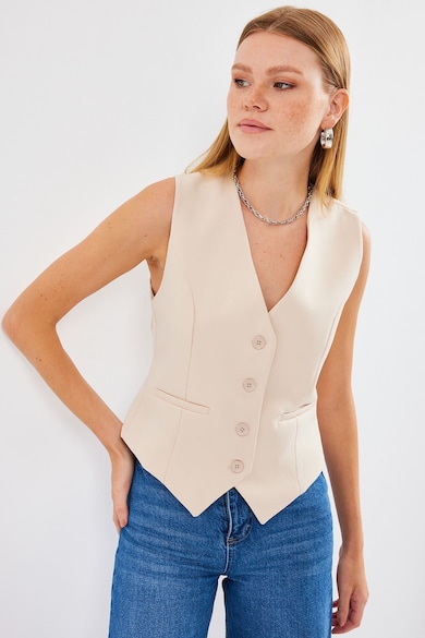 Vesta tricotata decolteu in V, inchidere cu nasturi, crem, jerseu